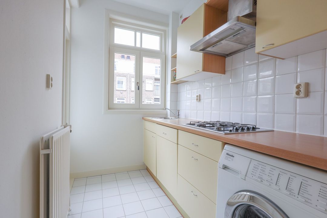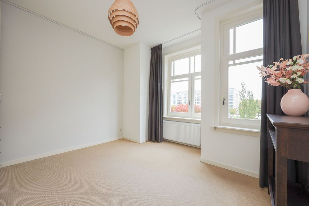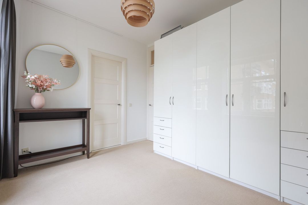 The bright and spacious living room features an elegant en-suite layout with no fewer than four built-in cupboards, offering plenty of storage space. At the front, the room overlooks Stadionplein and includes a charming French balcony, while at the back, French doors open onto a sunny, south-facing balcony perfect for enjoying a quiet moment outdoors.